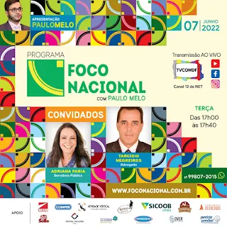 O FOCO NACIONAL vai ao ar, ao vivo, toda terça-feira, das 17h10 às 17h40, ancorado pelo jornalista Paulo Melo. Assista o programa do dia 07/06, no link: https://www.youtube.com/watch?v=PDvcE506Q5Q